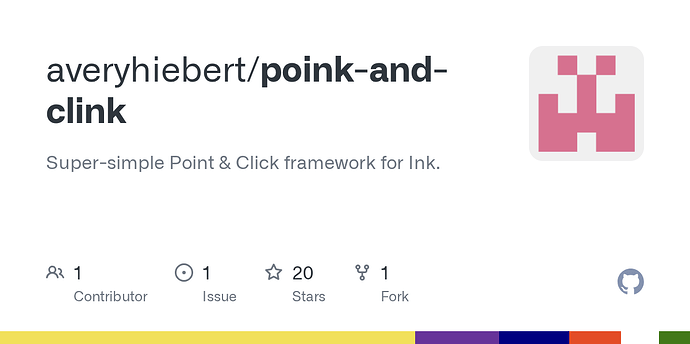Poink-and-Clink (« Poink » for short) is a drop-in replacement for the default web export template in Inky, adding support for simple point & click game functionality. Perfect for simple 2D point & click games, especially if you’re doing the art in Aseprite (there’s an export script!)